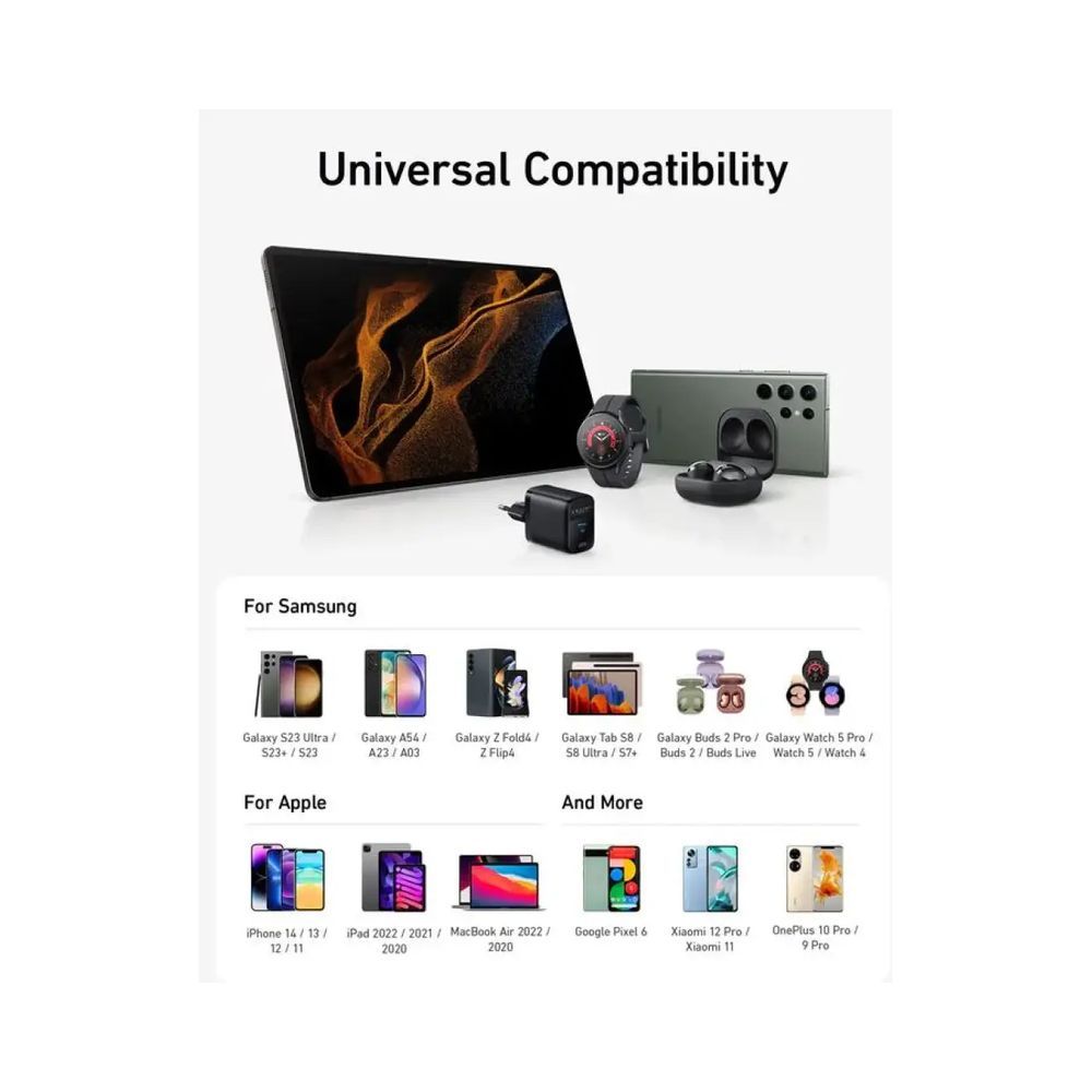 The charger features a USB Type-C port, which is the latest standard for charging and data transfer. USB-C offers a reversible connector, making it easier to plug in the charger without worrying about the orientation.