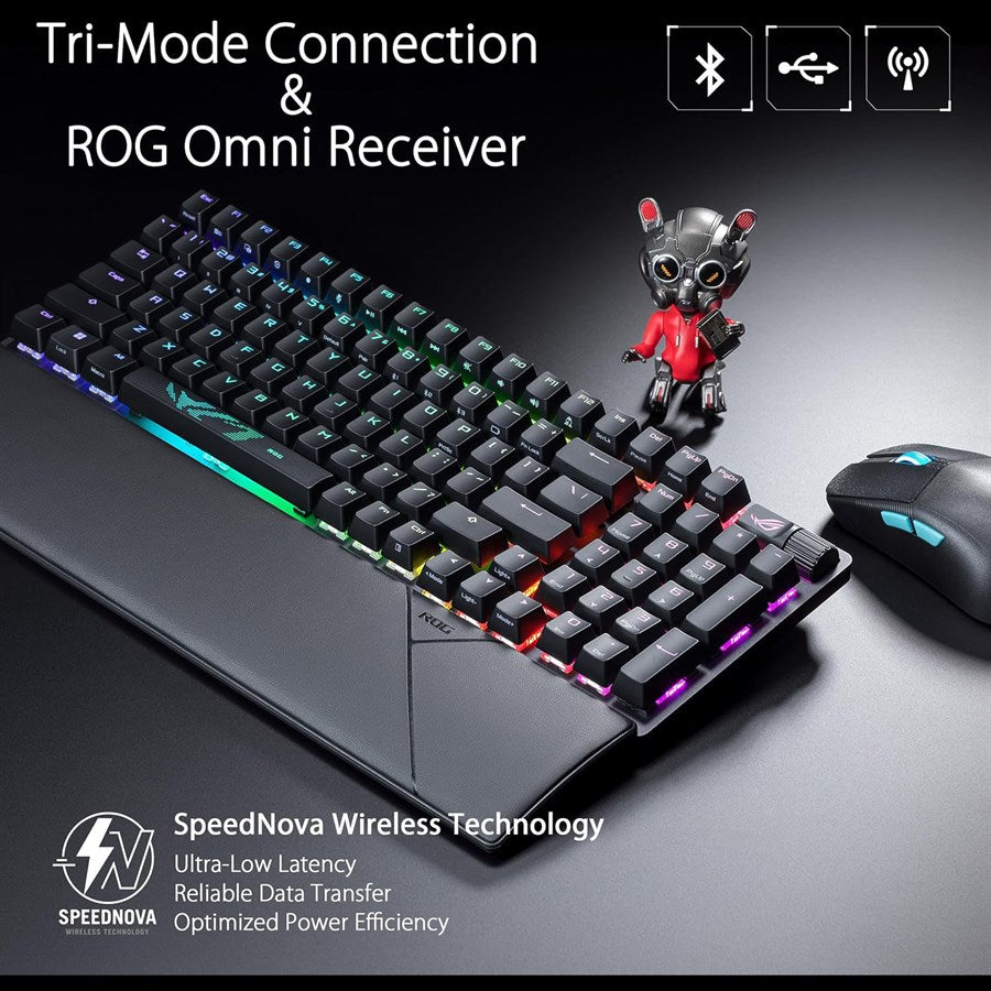 ROG Strix Scope II 96 Wireless gaming keyboard with tri-mode connection, streamer hotkeys, multifunction controls, hot-swappable pre-lubed ROG NX Snow & Storm mechanical switches, ROG keyboard stabilizers, PBT doubleshot keycaps and silicone dampening foam, three tilt angles, and wrist rest