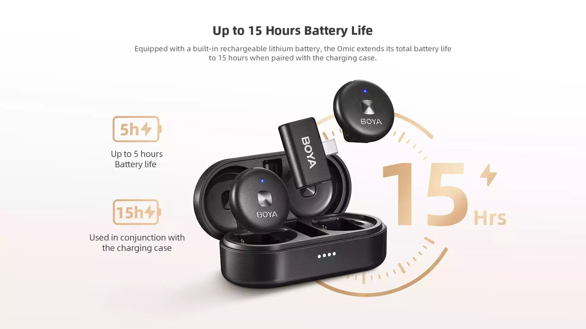 The BOYA Omic is an ultra-compact and portable 2.4GHz wireless microphone system, compatible with computers,Android/ iOs mobile devices and more. It features automatic pairing and selectable noise cancellation, delivering broadcast-quality sound with remarkable ease of use.The Omic is ideal for content creation, live streaming, vlogging, mobile journalism and much more. The USB-C receiver and iOS Lightning receiver are device powered and have USB-C charging ports, which support charging and powering of devices while in use. The included charging case allows you to charge the transmitter(s)anywhere, making the Omic kit easy to carry on.