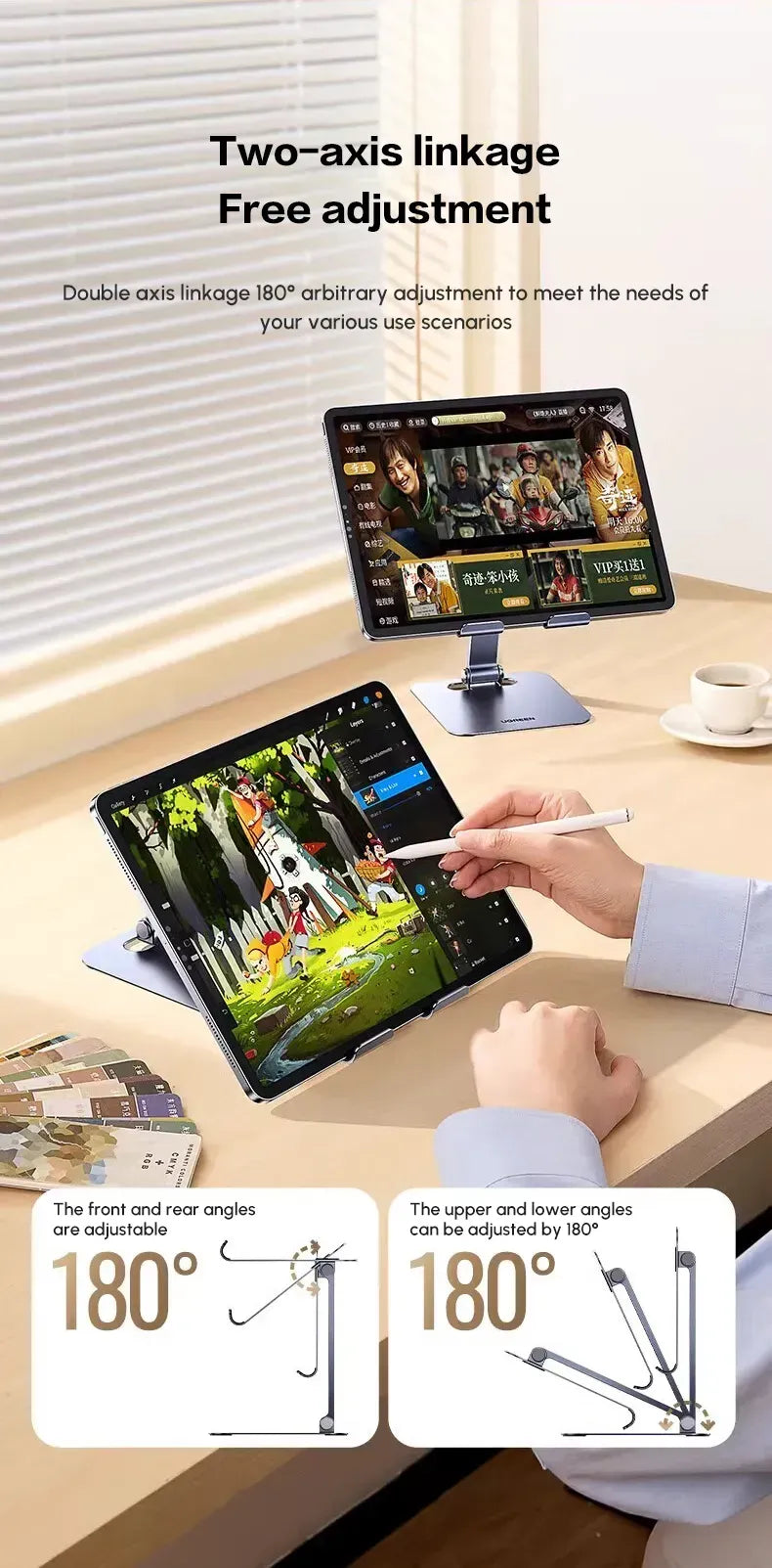 Two-Axis Adjustment: This stand features a sophisticated two-axis hinge system that offers an impressive 180° adjustment range for both up/down tilt and forward/backward angle, allowing you to find the absolute perfect viewing position for any task, reducing neck strain and improving ergonomics, whether you're cooking a recipe, sketching, or participating in a video conference.